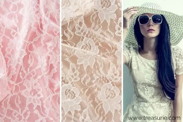 Chantilly Lace has a delicate floral design sewn or outlined with silk threads on a netting background. Originally, the color of the silk thread used was mostly black but modern Chantilly lace comes in a variety of different colors.