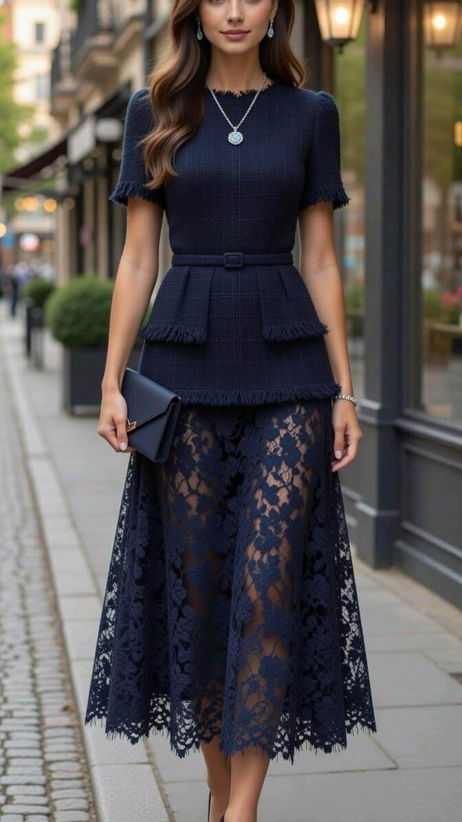 Navy lace suits mature customers, executive dressing, formal events, premium brands, and clients who want elegance with calm confidence rather than overt sweetness.