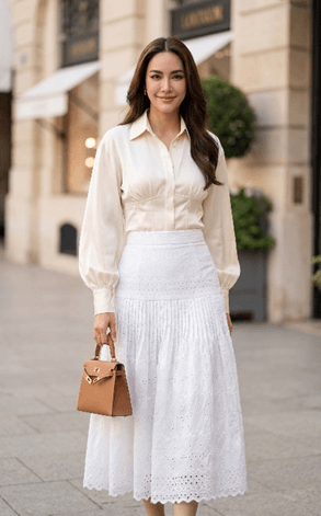 เมื่อผสาน “สี” เข้ากับ “ผ้าลูกไม้” ซึ่งเป็นวัสดุที่มีความละเอียดอ่อน มีมิติของลวดลาย และสะท้อนความหรูหรา สีของลูกไม้จึงไม่ได้เป็นเพียงการตกแต่ง แต่กลายเป็น ตัวกำหนดอารมณ์ (mood), ระดับความเป็นทางการ (formality), และ positioning ของเสื้อผ้า